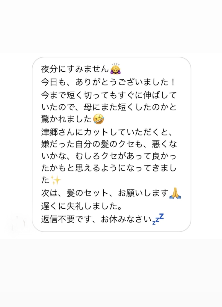 皆さまに共通していることは、〝悩みを解決したい〟〝こんな髪型にしてみたい〟〝いきつけの美容室を見つけたい〟〝髪型を楽しみたい〟〝自分の髪質を好きになりたい〟などの思いを持たれている方が多いことです。 - 今まで美容師さんに断られたりしたことがありますが、大丈夫でしょうか?
